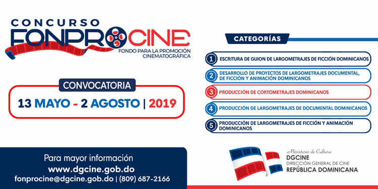 El FONPROCINE se crea a partir de la Ley No. 108-10, para el Fomento de la Actividad Cinematográfica en la República Dominicana. La convocatoria está abierta hasta el 2 de agosto del 2019, 5:00 p.m.