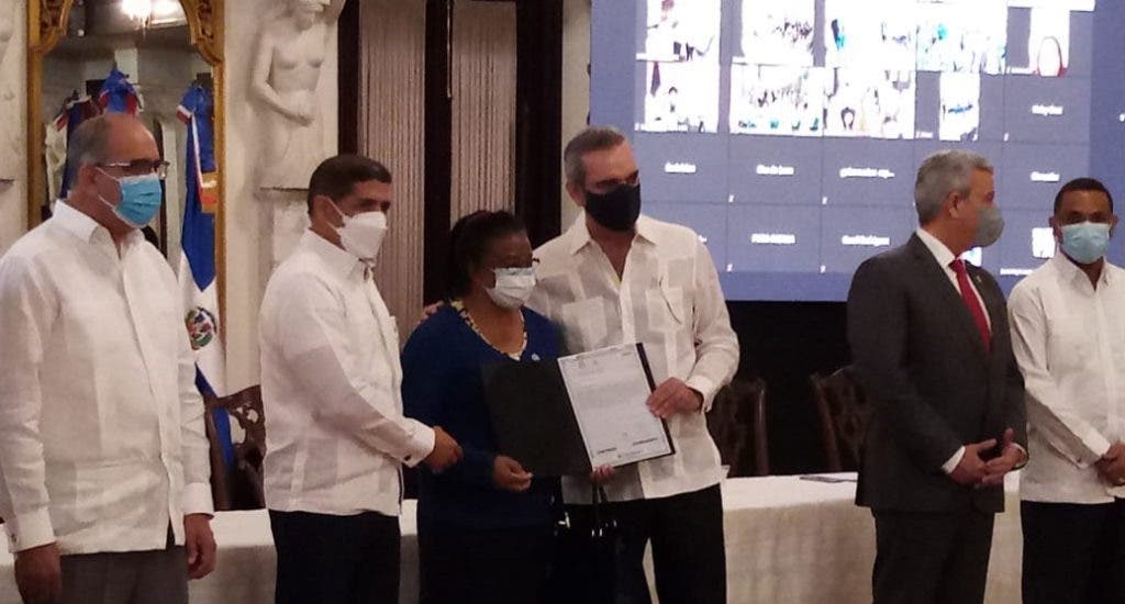 El Salón Las Cariátides, del Palacio Nacional, fue el escenario donde se realizó la entrega con una representación de 40 parceleros de Reforma Agraria y la transmisión vía zoon.